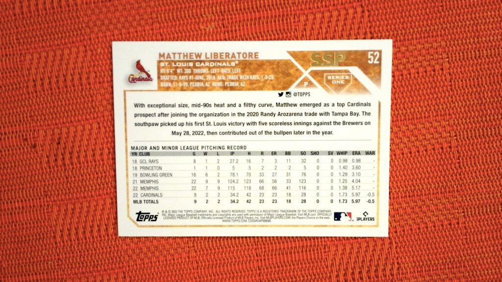 This is a nice example of a 2023 Topps #52 Matthew Liberatore Base Golden Mirror Image Variation SSP.