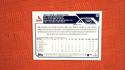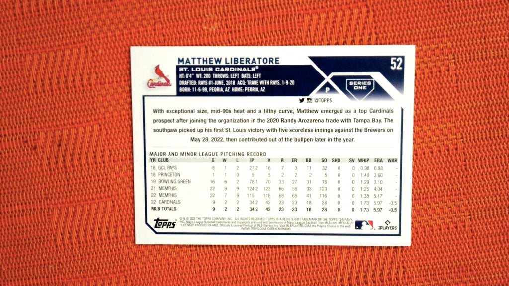 This is a nice example of a 2023 Topps #52 Matthew Liberatore Rainbow Foil.
