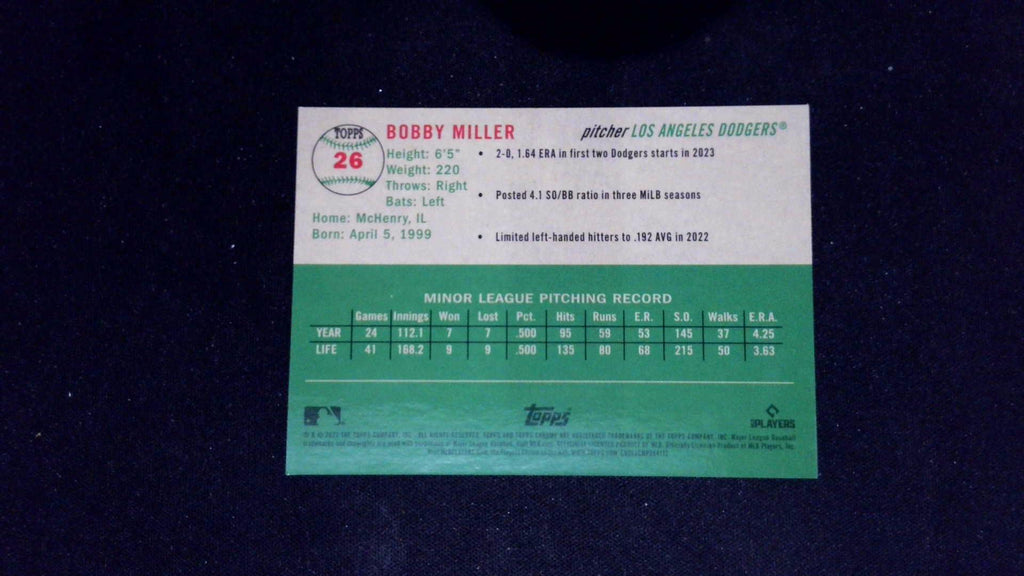 This is a nice example of a 2023 Topps Chrome Platinum Anniversary #26 Bobby Miller Speckle Refractor.