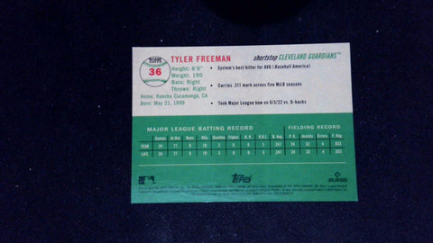 This is a nice example of a 2023 Topps Chrome Platinum Anniversary #36 Tyler Freeman Blue Mini-Diamond Refractor.