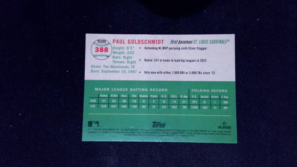 This is a nice example of a 2023 Topps Chrome Platinum Anniversary #388 Paul Goldschmidt Refractor.