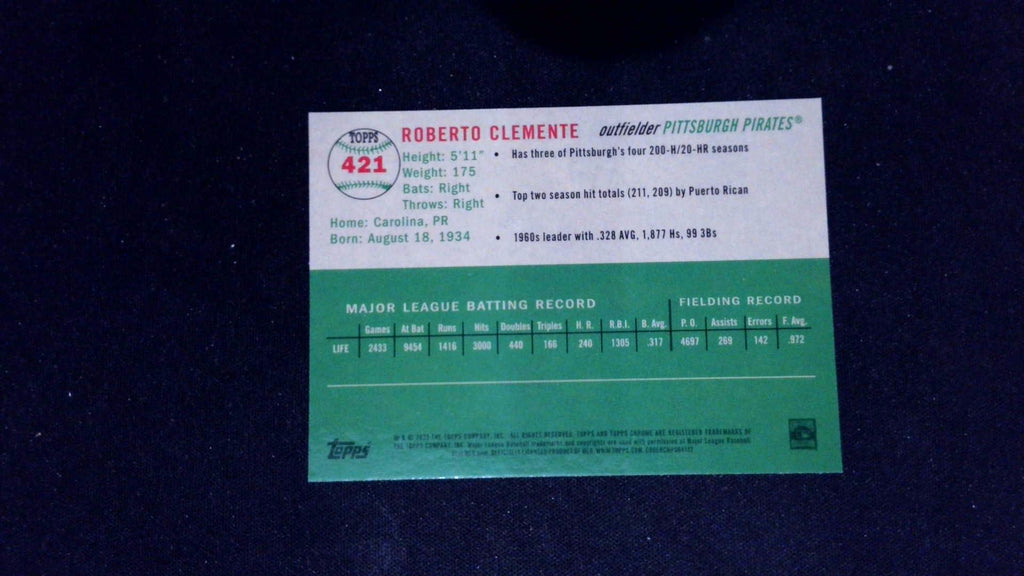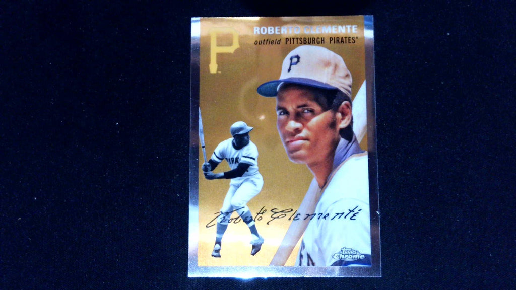 This is a nice example of a 2023 Topps Chrome Platinum Anniversary #421 Roberto Clemente .