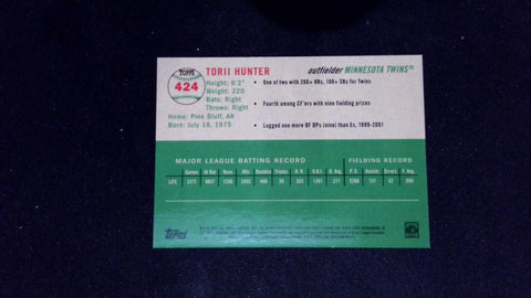 This is a nice example of a 2023 Topps Chrome Platinum Anniversary #424 Torii Hunter Topps Refractor.