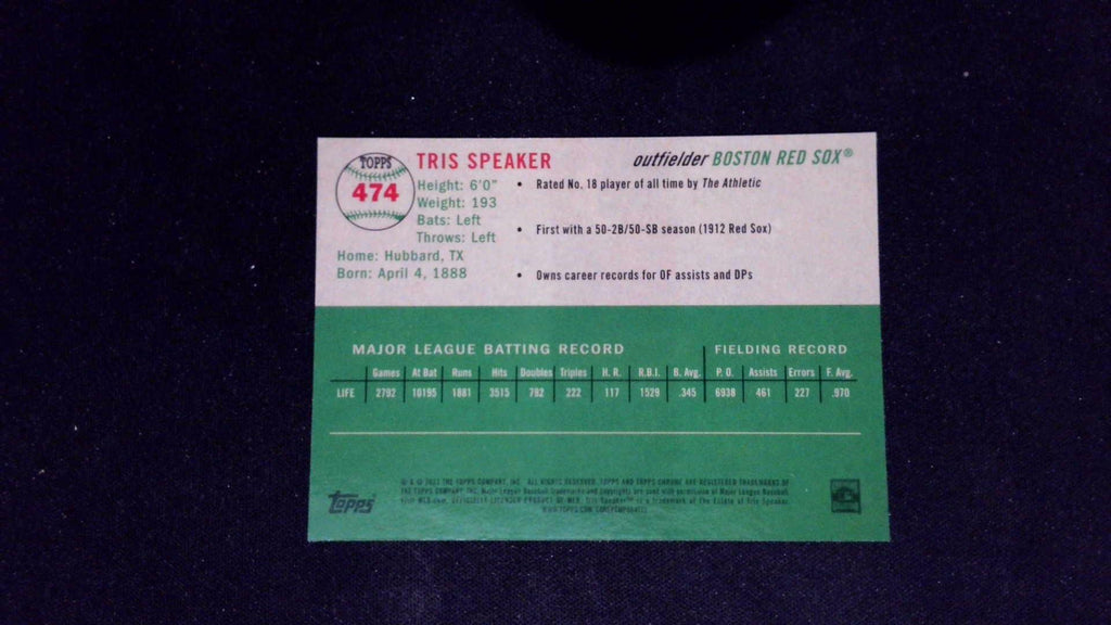 This is a nice example of a 2023 Topps Chrome Platinum Anniversary #474 Tris Speaker Refractor.