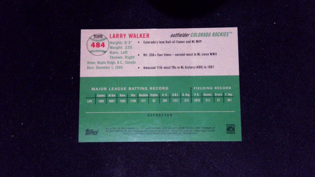 This is a nice example of a 2023 Topps Chrome Platinum Anniversary #484 Larry Walker Refractor.