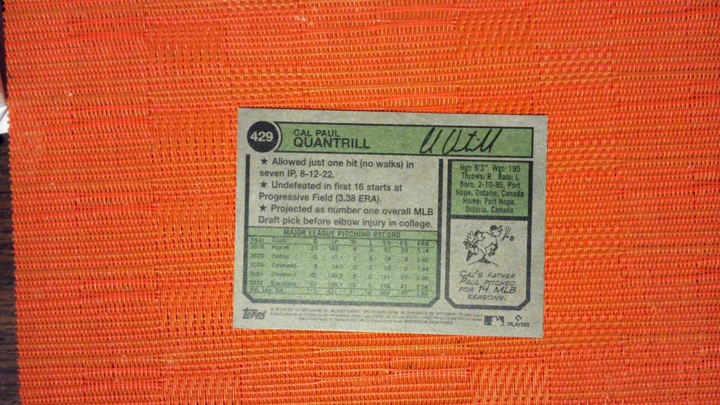 This is a nice example of a 2023 Topps Heritage #429 Cal Quantrill .