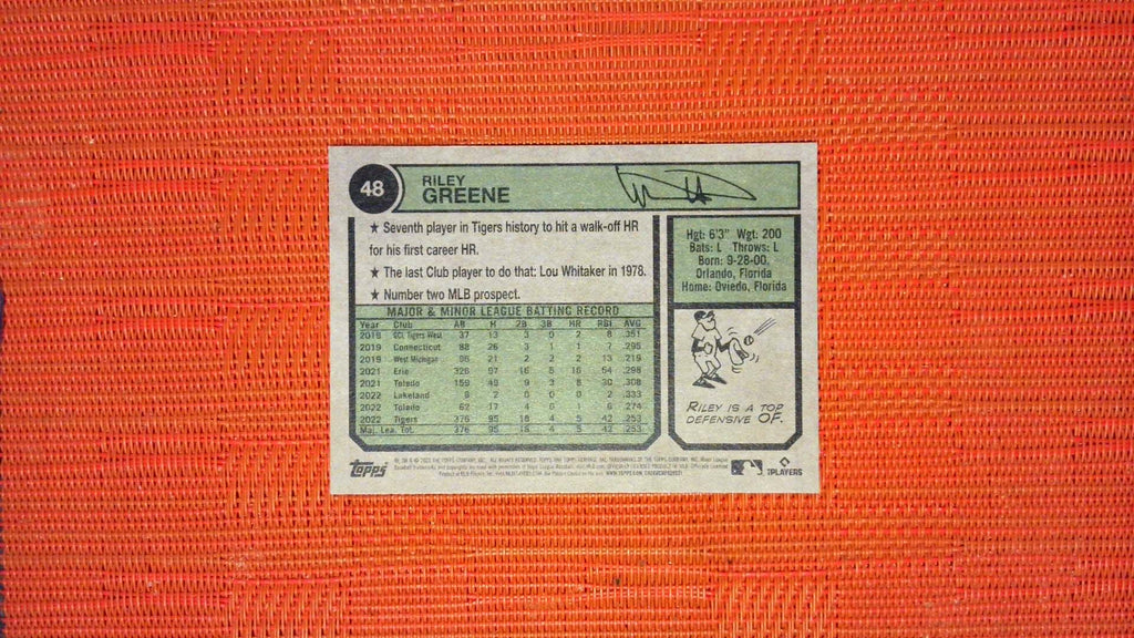This is a nice example of a 2023 Topps Heritage #48 Riley Greene .