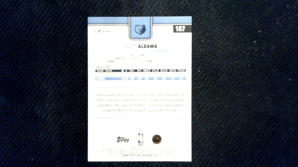 This is a nice example of a 2025-26 Topps #187 Santi Aldama Gold.