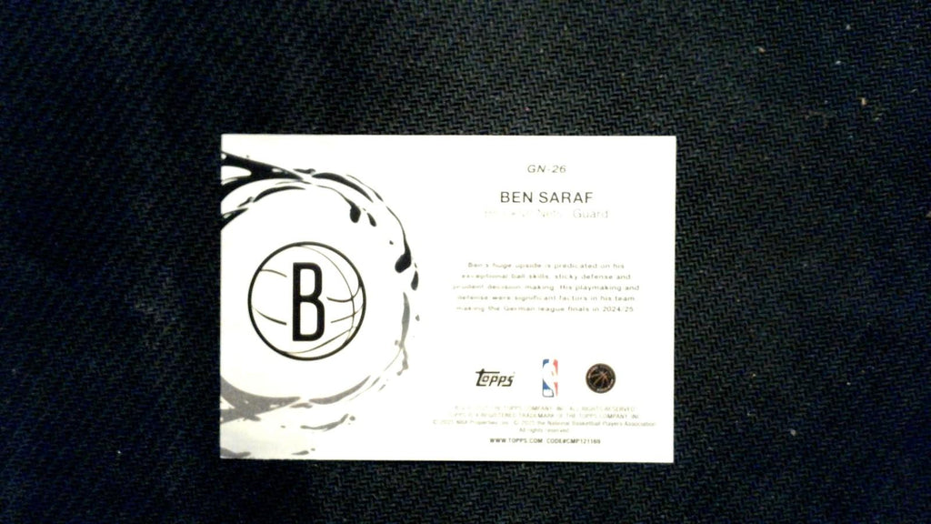 This is a nice example of a 2025-26 Topps #GN-26 Ben Saraf Generation Now.